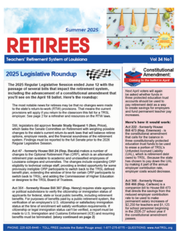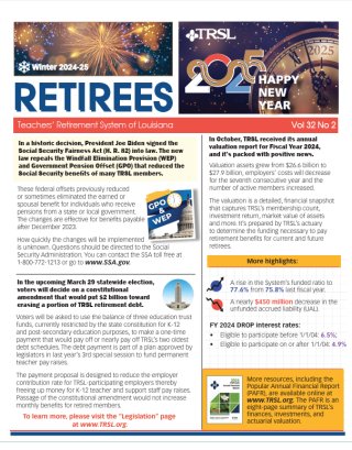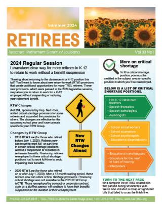 Retirees is TRSL's newsletter for retired members of the system. It is published and mailed to retirees twice a year in June and December. Retirees will find important news and information about their retirement benefits and the retirement system in this newsletter.
